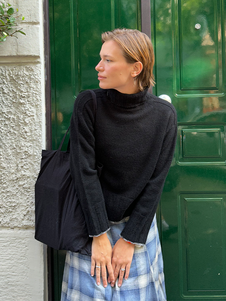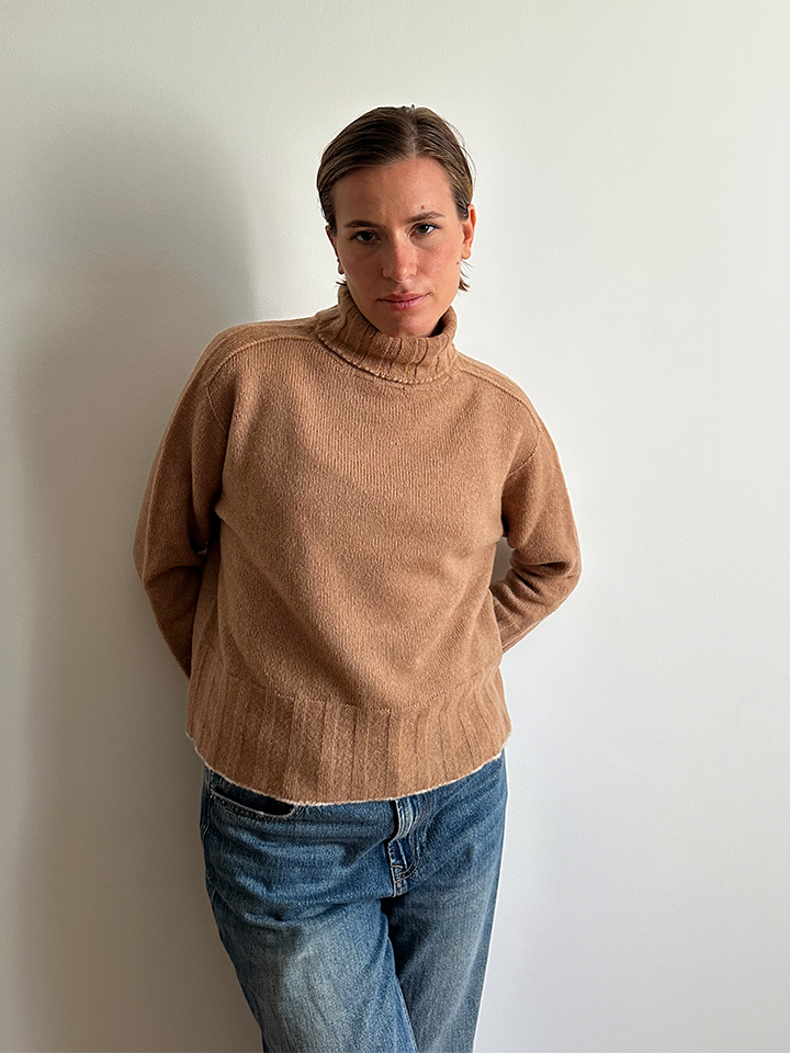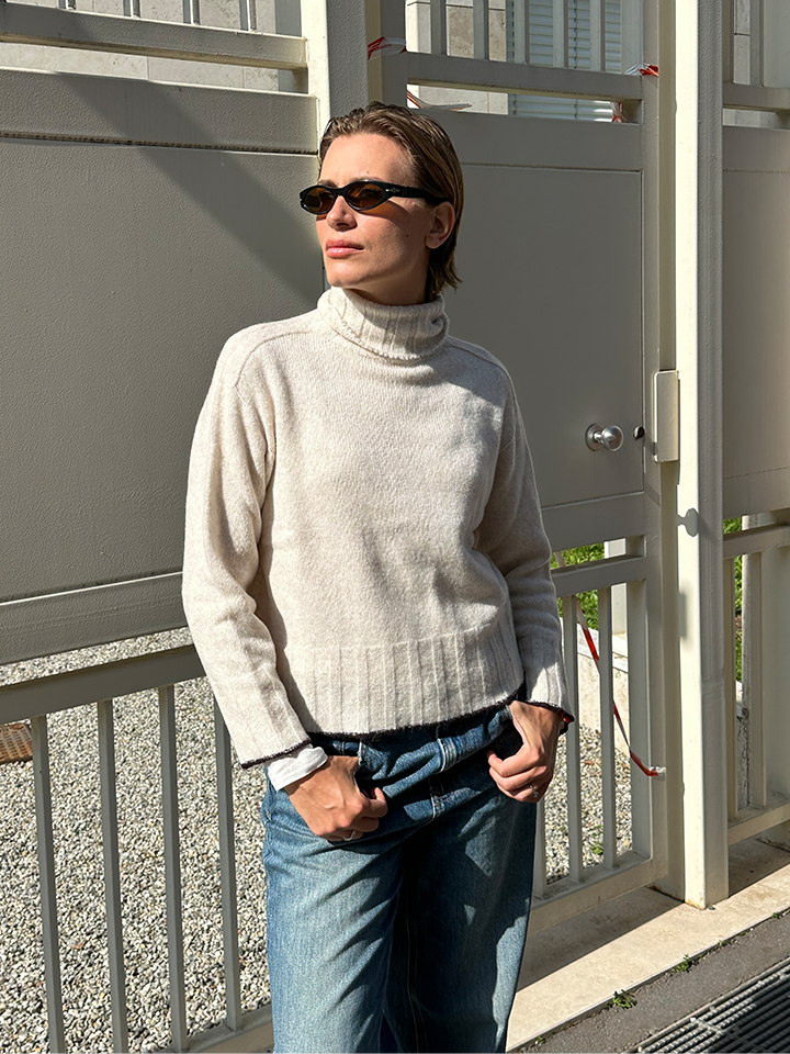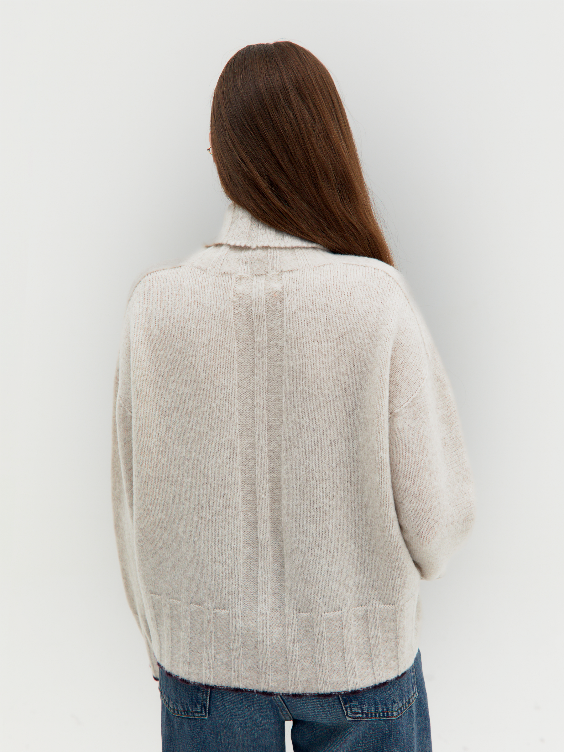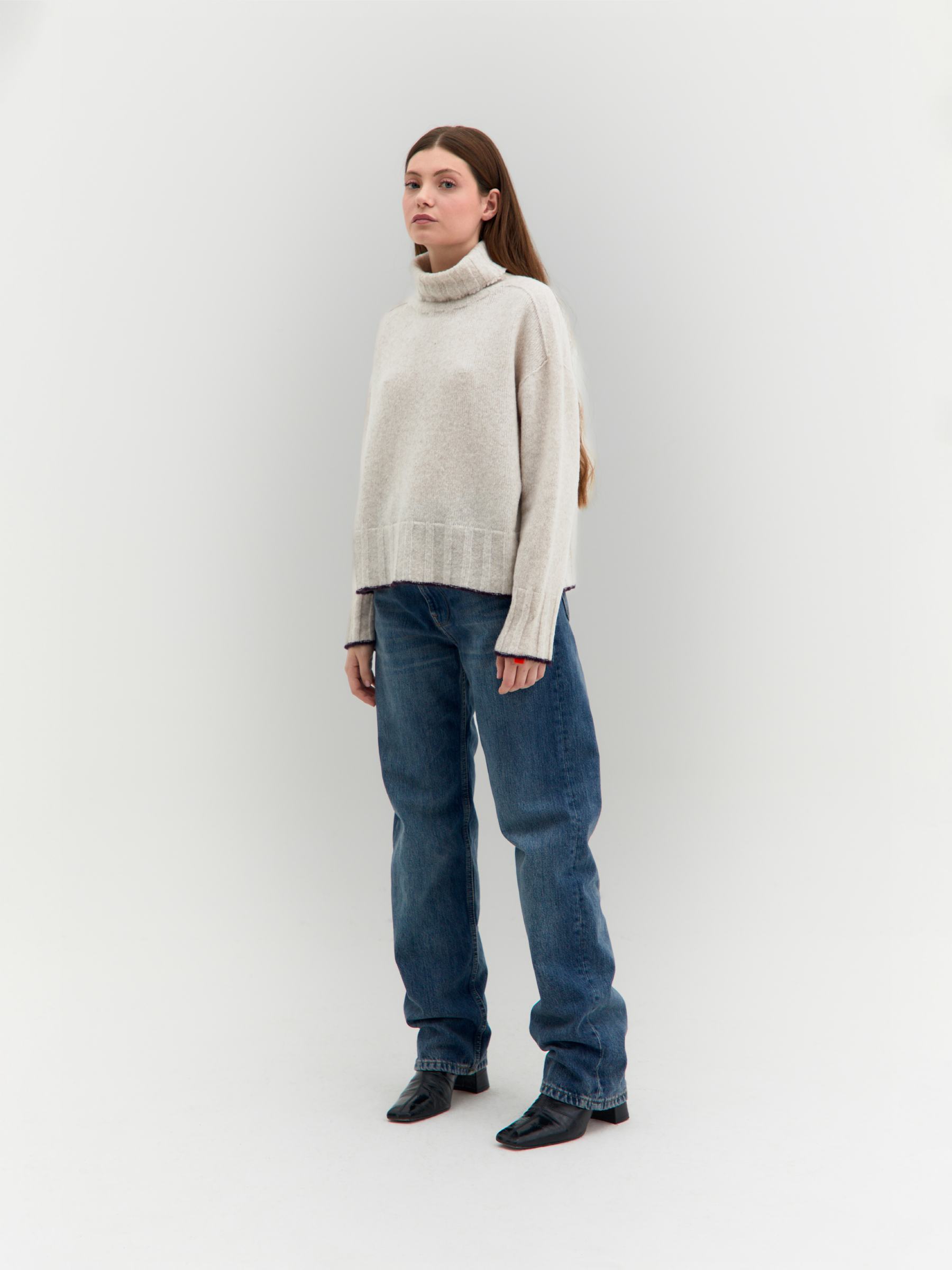 Soft knit sweater with a roll-neck and ribbed hem and cuffs. Contrasting trim. Loose and comfortable fit, perfect for the colder months. Ideal with denim or wide-leg trousers.