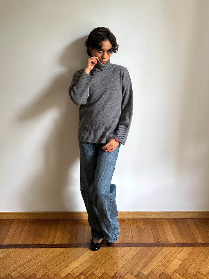 Turtleneck with contrasting color thread on the sides. Soft and comfortable fit, ideal for transitional seasons. Perfect with wide-leg trousers or denim.