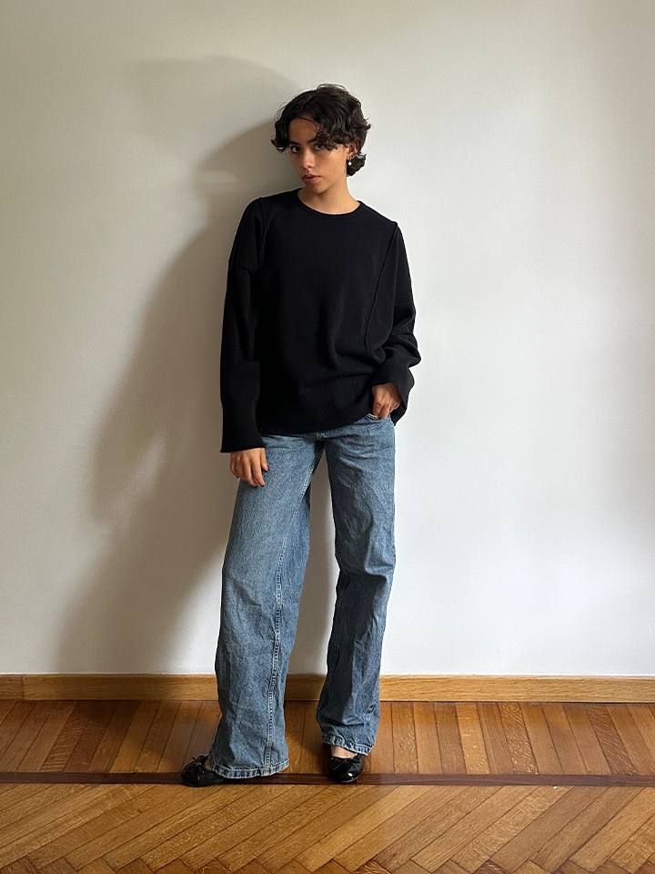 Boxi fit crew neck sweater with details on the front. Loose and comfortable fit, perfect for transitional seasons. Ideal with denim or full skirts.