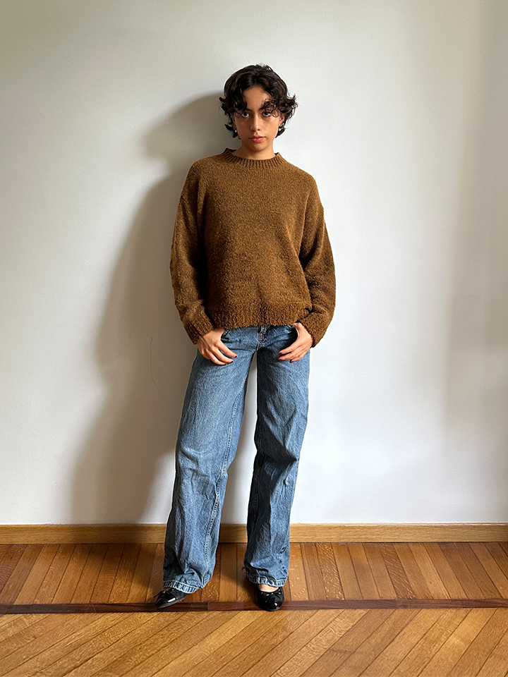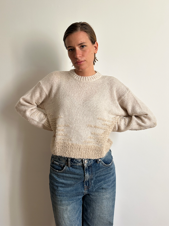 Crew neck sweater with a shaded bouclé knit. Loose and comfortable fit, perfect for the colder months. Ideal with denim or wide-leg pants.