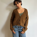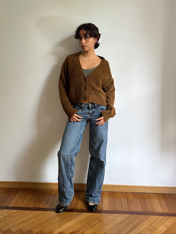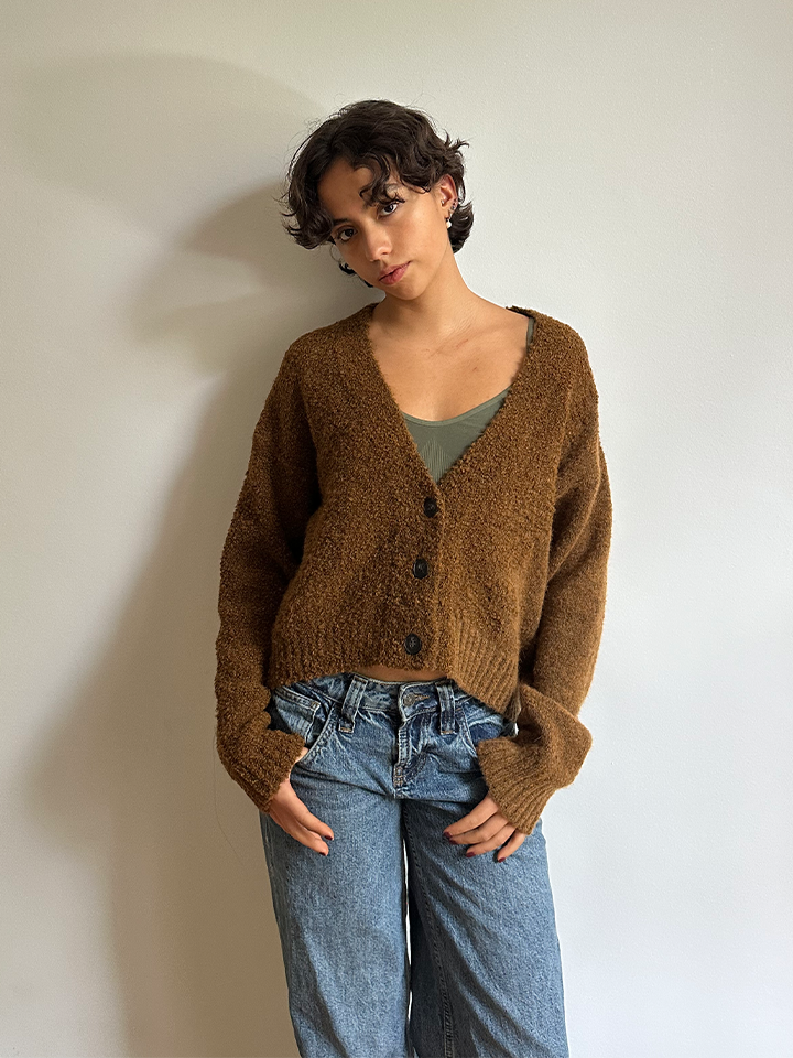 Cardigan morbido con lavorazione sfumata in bouclé. Vestibilità ampia e cropped, perfetto per i mesi più freddi. Ideale con denim o pantaloni ampi.