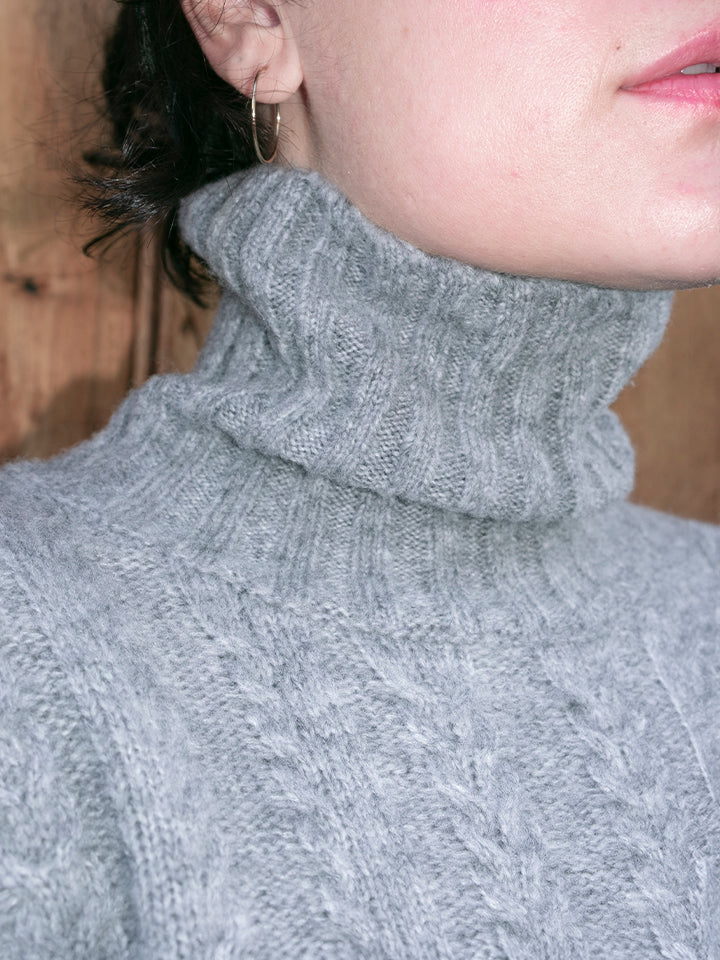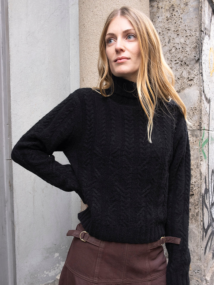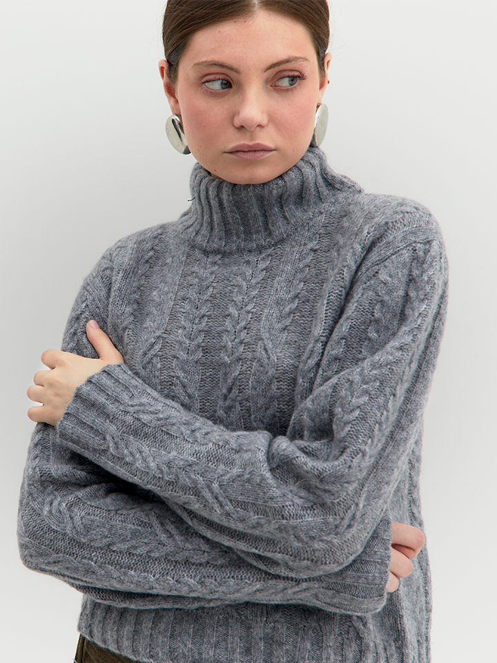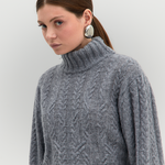 Maglione chunky in maglia lavorata con motivo a trecce e collo alto avvolgente. Finiture a coste su fondo e polsini per un look caldo e strutturato. Vestibilità regolare, perfetto da indossare con gonne, pantaloni o sopra un vestito per affrontare i mesi freddi con stile.