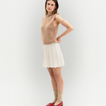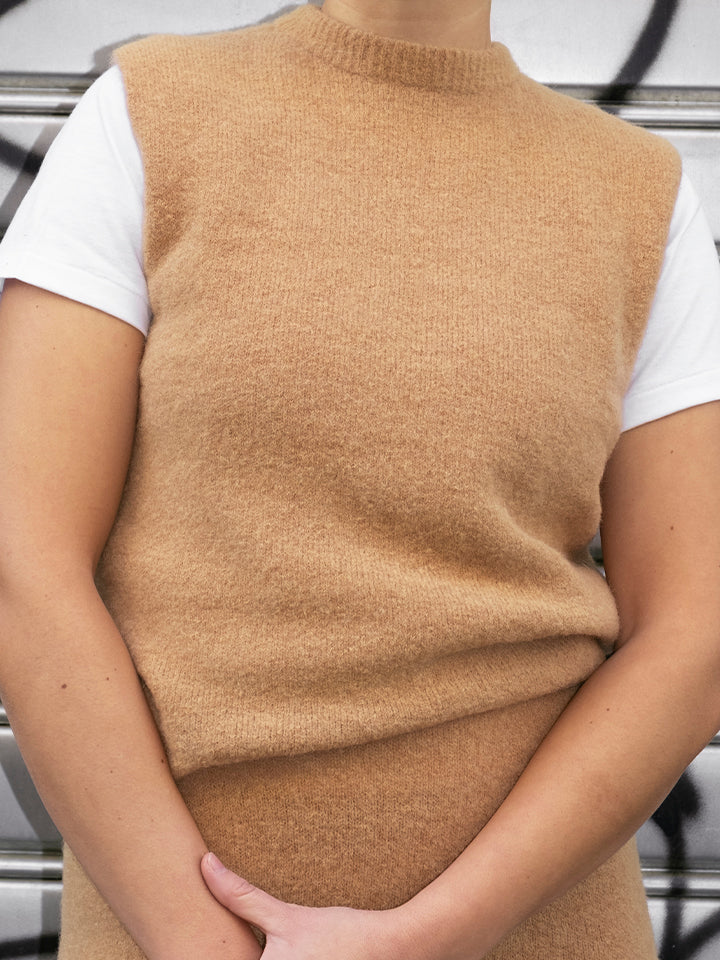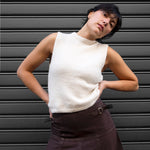 Top in maglia rasata, smanicato e con collo leggermente alto. Linea essenziale e fit regolare, ideale come base nei look a strati o da solo nelle mezze stagioni. Vestibilità dritta e confortevole, perfetto con gonne fluide o pantaloni a vita alta per uno stile semplice ma curato.