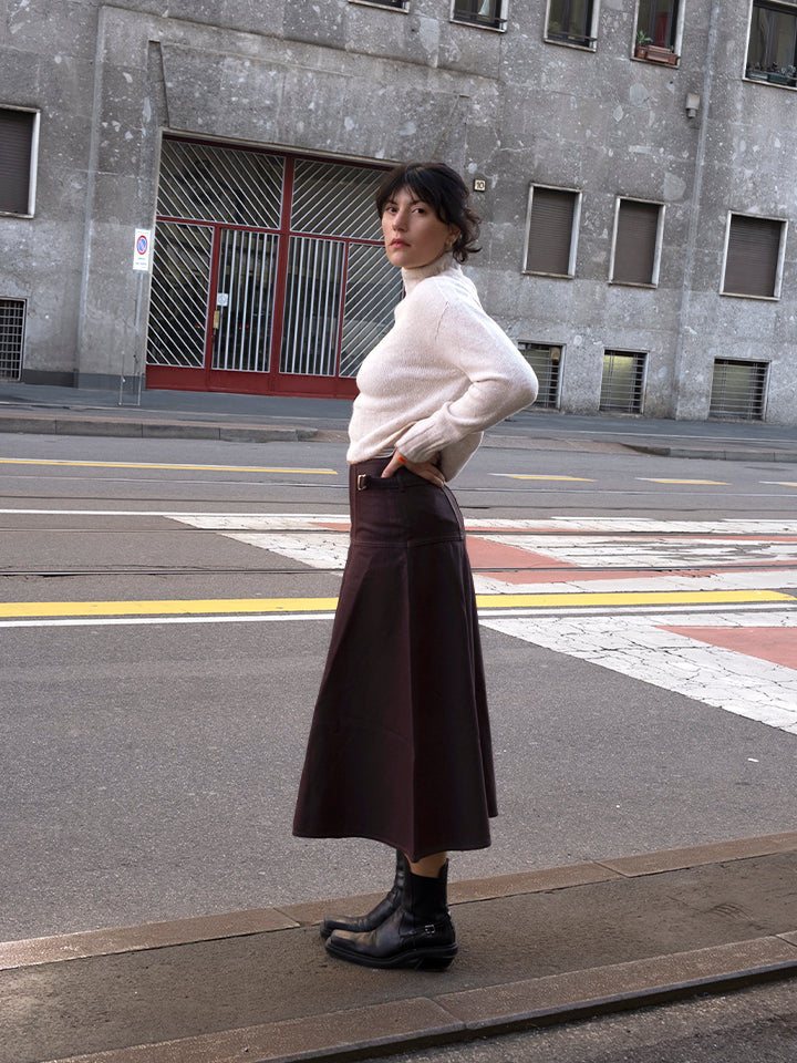 Si consiglia il lavaggio a mano in acqua fredda o, in alternativa, un ciclo lana a bassa temperatura e senza centrifuga. Dopo il lavaggio, lascia asciugare il capo in piano, lontano da fonti di calore, evitando l’asciugatrice. Se necessario, puoi stirarlo a bassa temperatura con un panno di protezione. Conserva la maglia piegata e non appesa, così manterrà sempre la sua forma originale. In generale, se non necessario, è preferibile far arieggiare il capo piuttosto che sottoporlo al lavaggio.