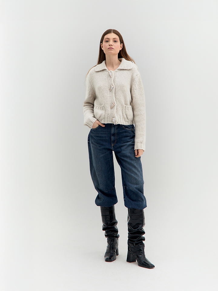 Cardigan in maglia grossa con collo classico, chiusura frontale con alamari e tasche applicate. Texture corposa e stile rétro per un capo caldo e originale, perfetto per completare look casual. Vestibilità regolare e confortevole, ideale con denim o pantaloni morbidi per un look cozy dallo stile deciso.